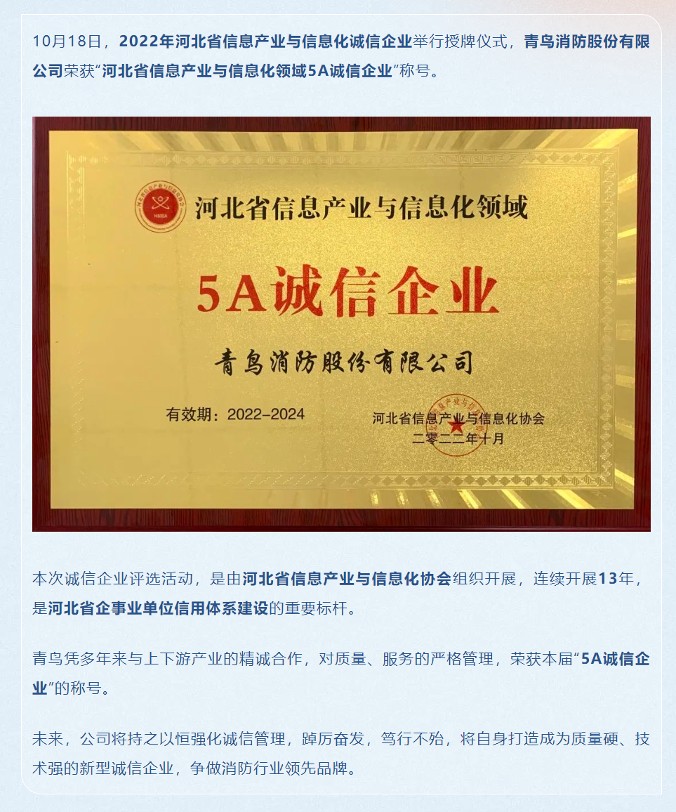 青鳥消防榮獲“河北省信息產(chǎn)業(yè)與信息化領(lǐng)域5A誠信企業(yè)”稱號